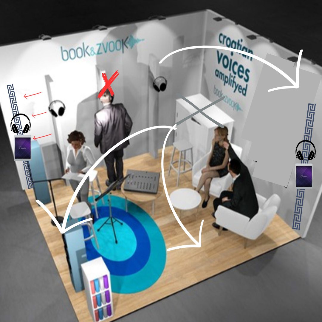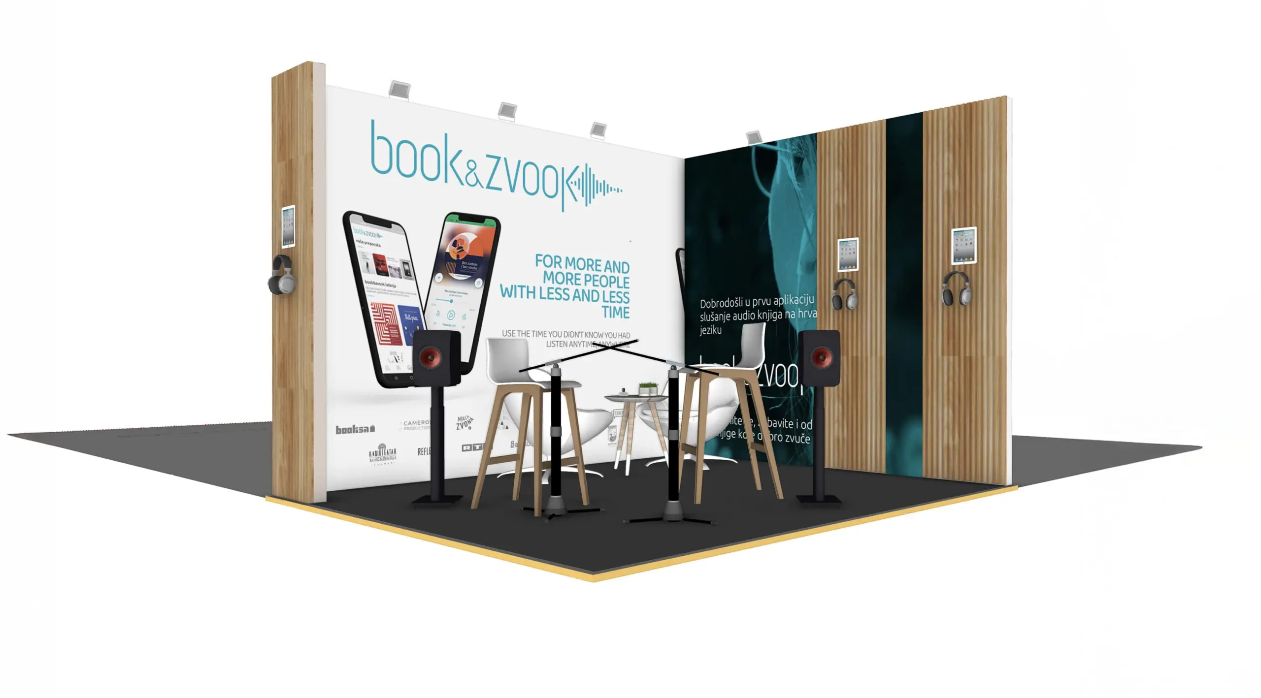 The concept needed to combine a broadcast-style setup with space for meetings, while showcasing their audiobook platform in a way that reflected their digital-first approach.